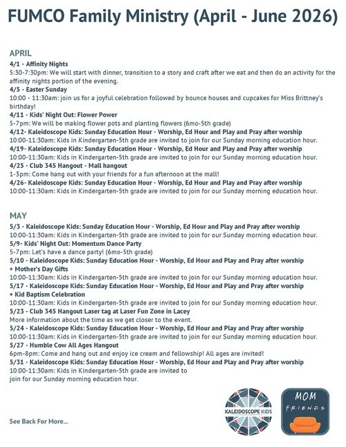 These events happen the second Saturday of every month from 5:00-7:00pm. Registration is required but always open and free to our community. (These are drop off events, meaning grownups cannot stay unless they have a formal background check and have completed a MinistrySafe training through FUMCOLY). Because of the huge success of these events, we have to have registration to plan for food and volunteers. You can find the registration link each month in our weekly emails or on our social media pages. Kids’ Night out is open to children age 6 months-5th grade.